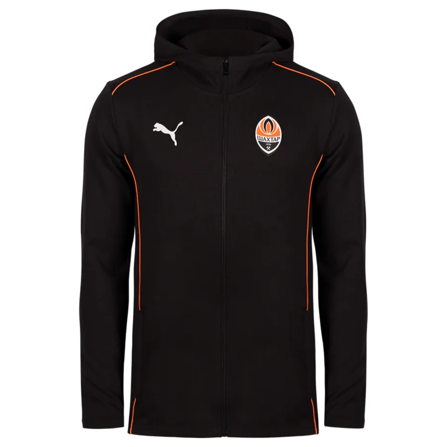 Die klassische Trainingsjacke mit Vereinslogo und Kapuze wird nie aus der Mode kommen! Das Modell aus der offiziellen Kollektion von Alltagskleidung in den Farben Orange und Schwarz ist die Wahl der Mitarbeiter des FC Shakhtar.