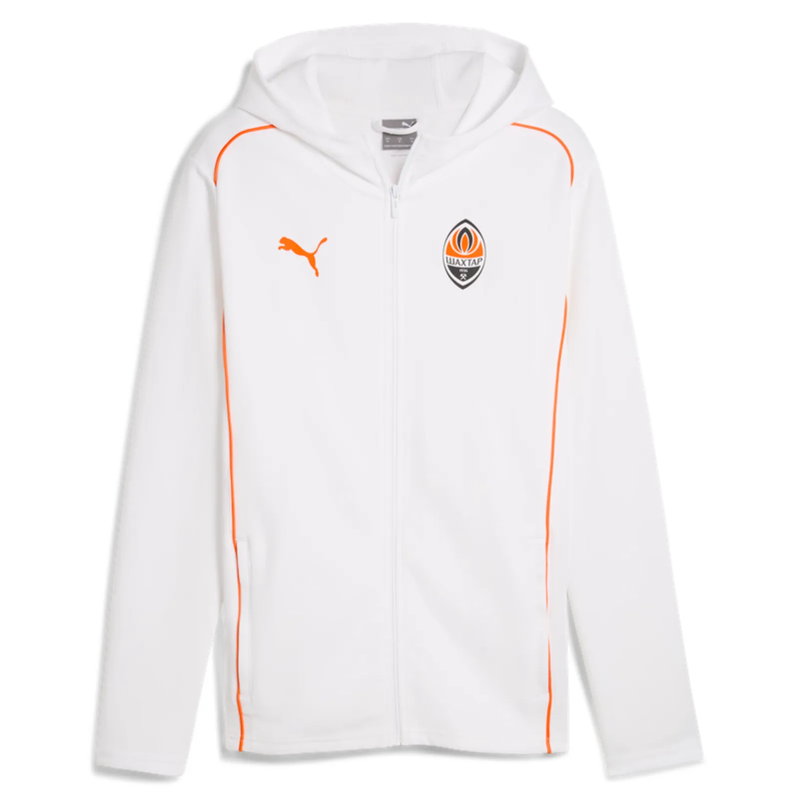 Die klassische Trainingsjacke mit Vereinslogo und Kapuze wird nie aus der Mode kommen! Das Modell aus der offiziellen Kollektion von Alltagskleidung in den Farben Orange und Schwarz ist die Wahl der Mitarbeiter des FC Shakhtar.