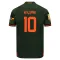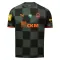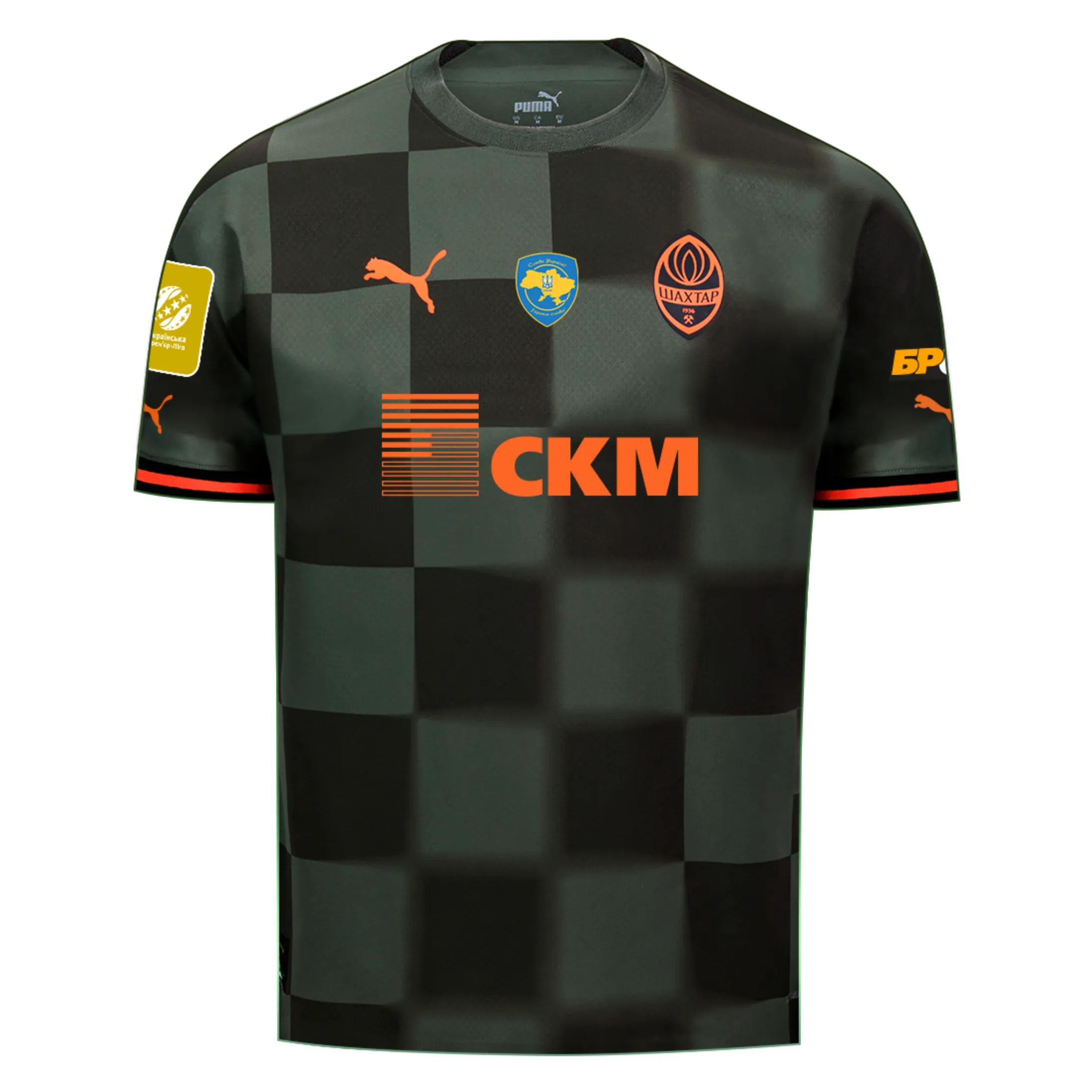 A classic design combines sharp shapes with a gradient blur effect in a chequered pattern across the entire surface. The dark green Puma FCSD away jersey has orange inserts on the sleeves.