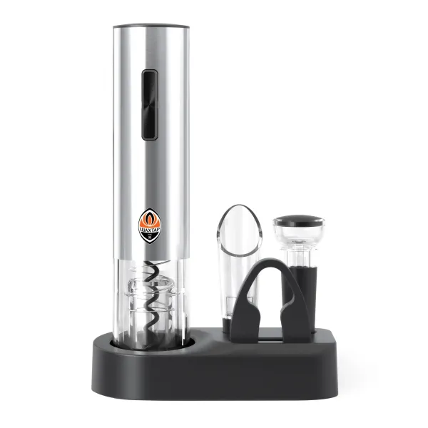 Набір для вина ФК «Шахтар» – сучасний і стильний аксесуар, що стане незамінним помічником для любителів винних напоїв. Завдяки автоматичному електроштопору ви зможете легко й швидко відкоркувати будь‑яку пляшку вина. Достатньо встановити штопор на пляшку, натиснути кнопку – і вже за кілька секунд корок акуратно витягнуто.