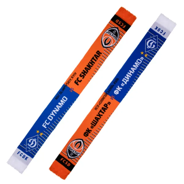 Матчевий шарф між «Шахтар» – «Динамо». Шарф в'язаний, двосторонній, декорований по краях бахромою, виконаний з високоякісних матеріалів.